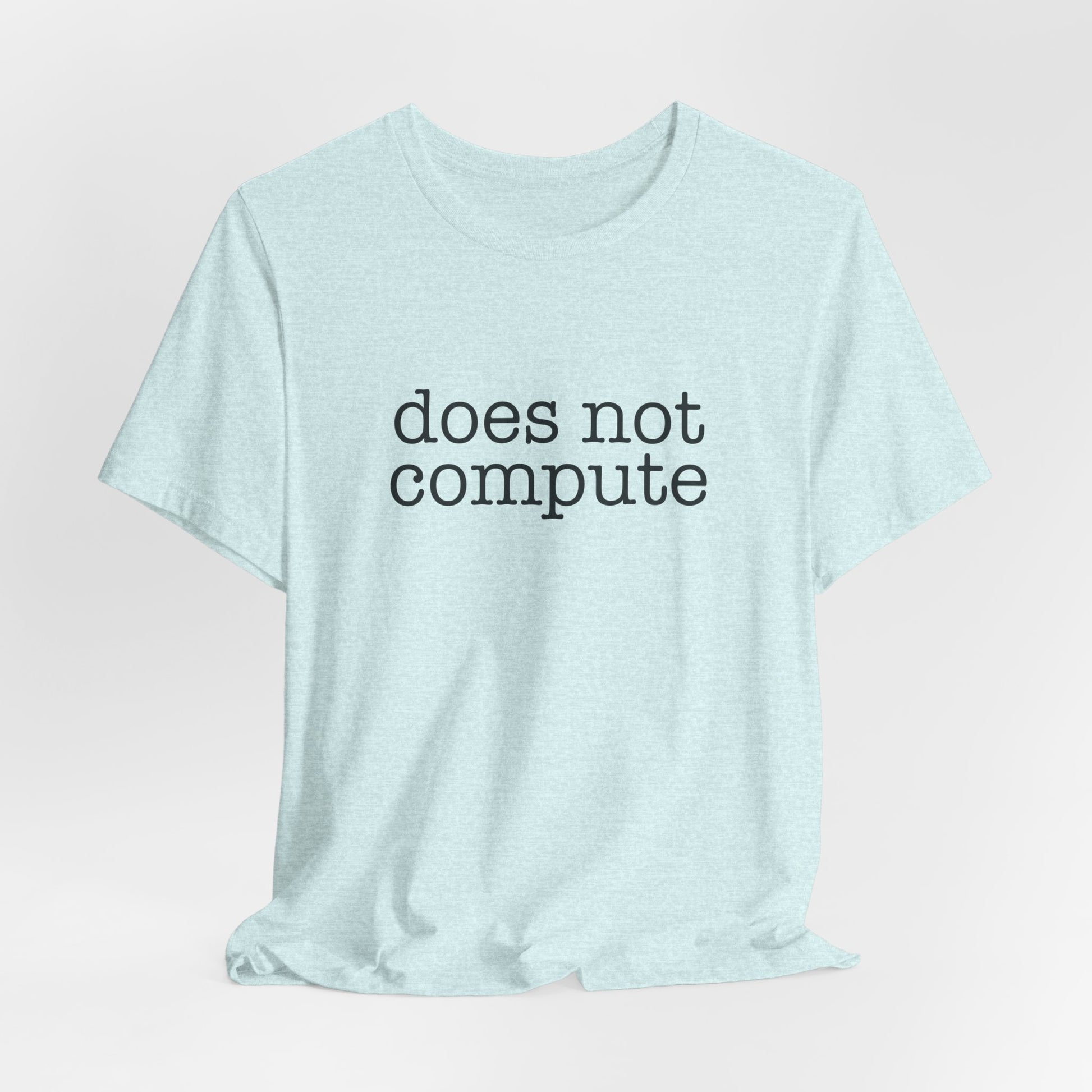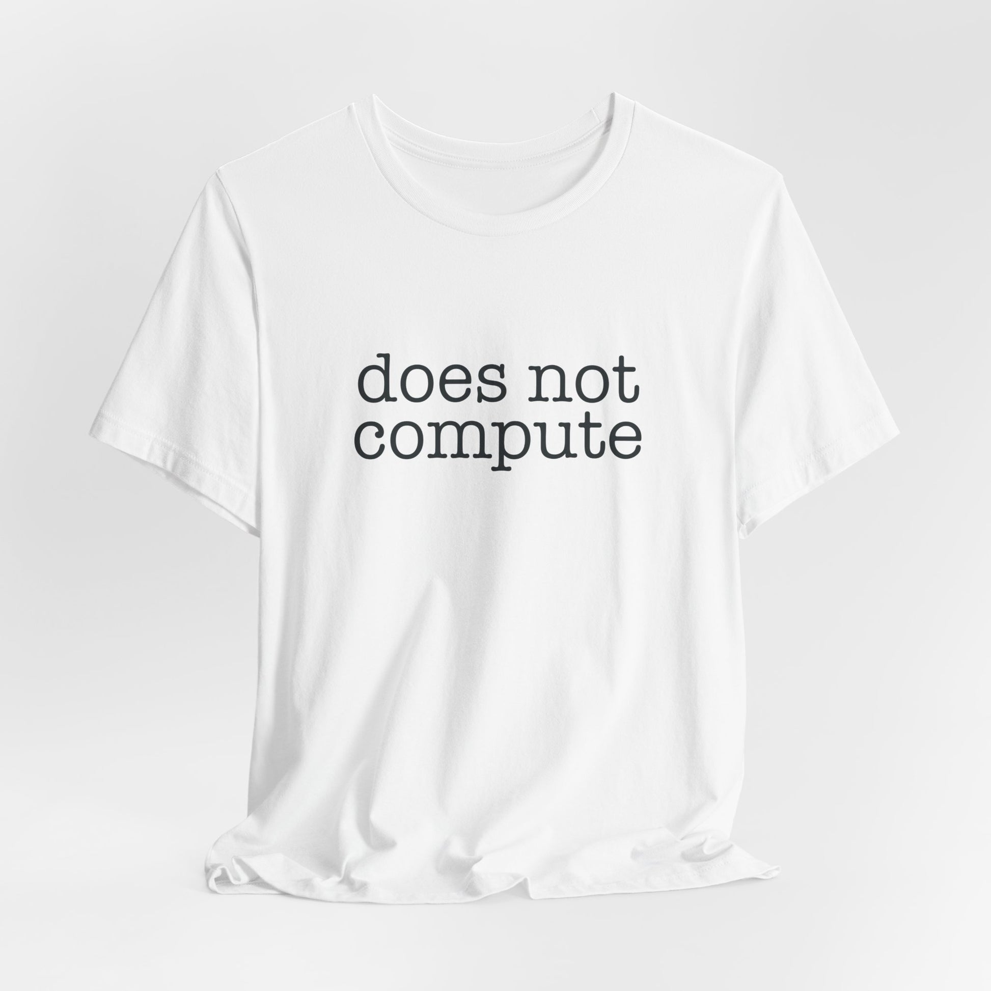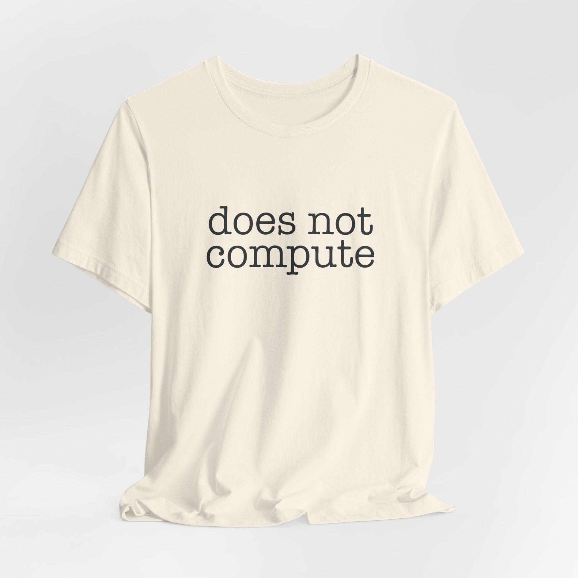 Does not compute. An analog classic. A crisp, honest tee with a wry, minimalist statement—stacked bold type reads “does not compute” down the front, leaving space for a smirk. The lightweight, airy cotton feels soft against skin and breathes easily under a jacket or on its own. Clean crew neckline and tailored retail fit keep the silhouette neat for everyday wear. Wear it to meetings you want to quietly exit, weekend errands when you need a little humor, or low-key gatherings where understatement speaks loudest.
