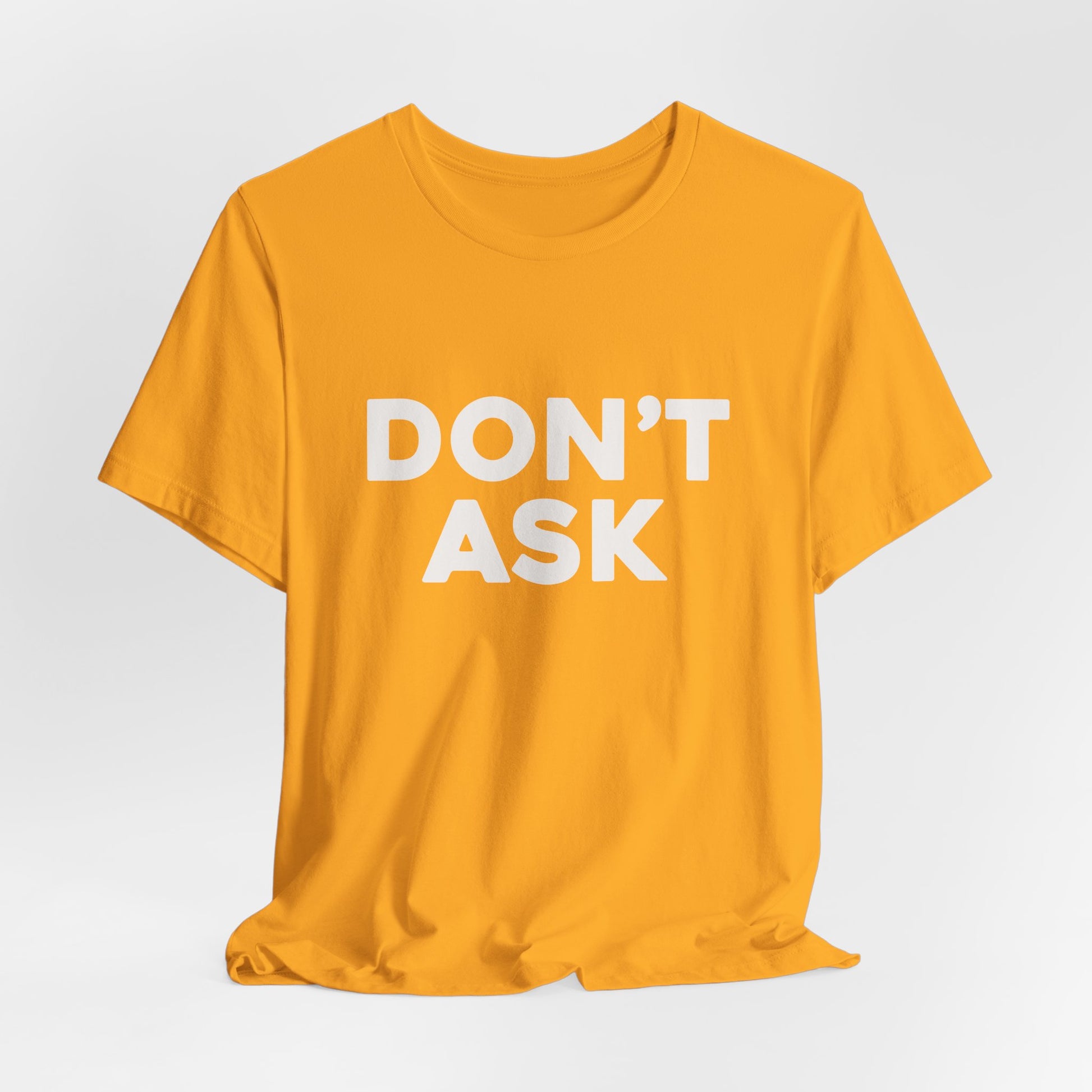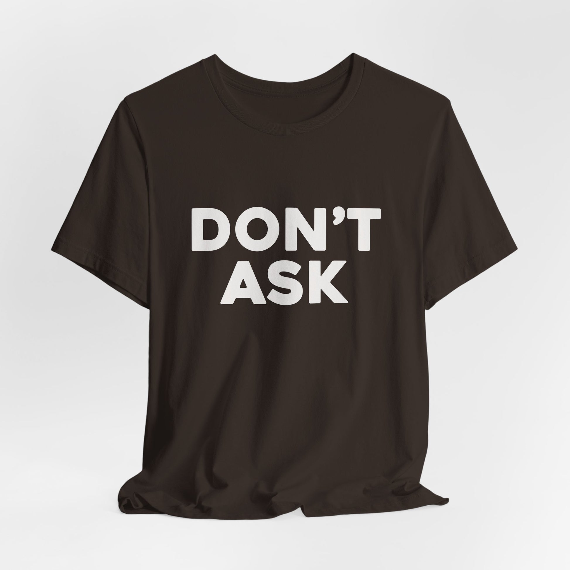 Don't ask. Seriously. A crisp, honest tee with a wry, minimalist statement—stacked bold type reads “DON'T ASK” on the front, leaving space for a smirk. The lightweight, airy cotton feels soft against skin and breathes easily under a jacket or on its own. Clean crew neckline and tailored retail fit keep the silhouette neat for everyday wear. Wear it to meetings you want to quietly exit, weekend errands when you need a little humor, or low-key gatherings where understatement speaks loudest.