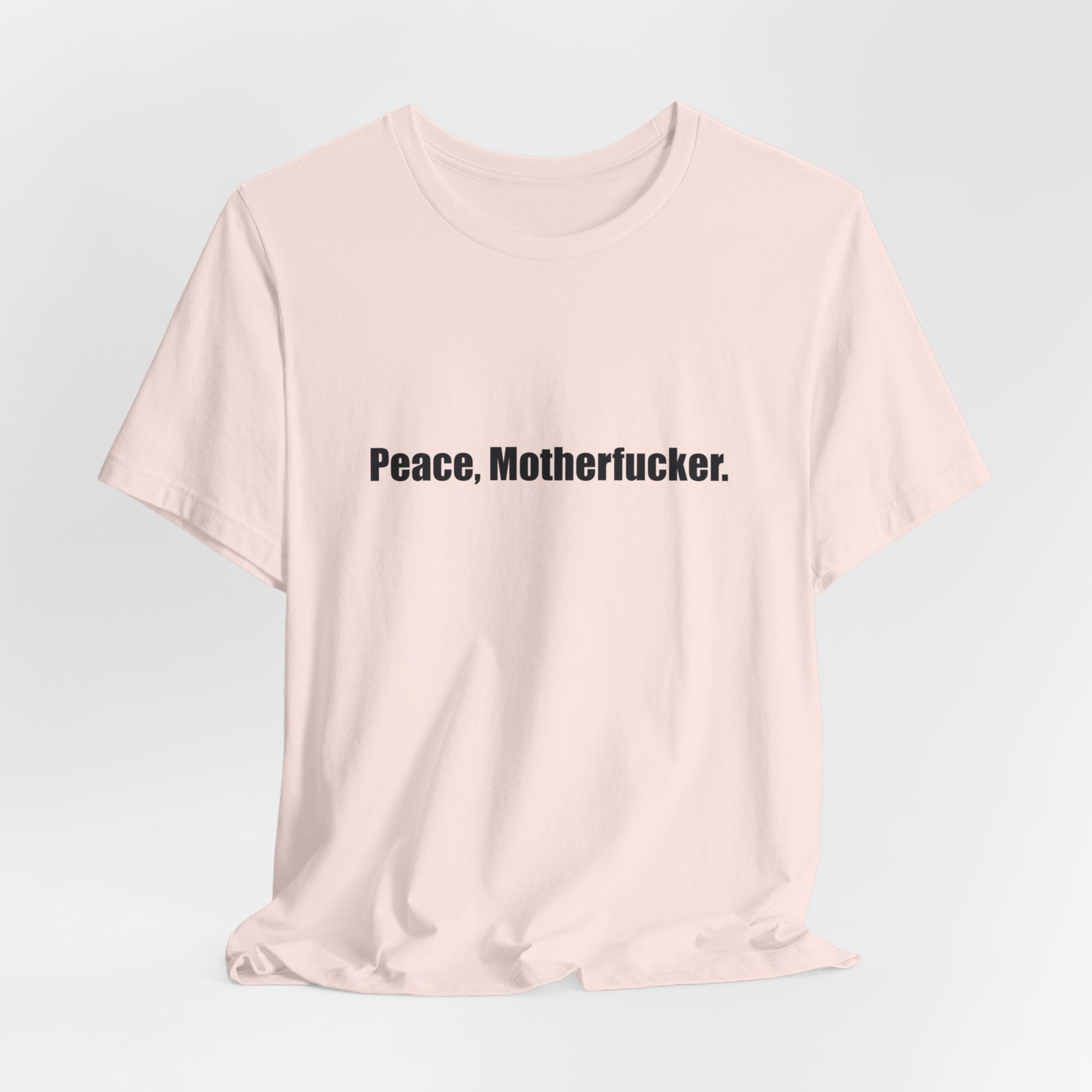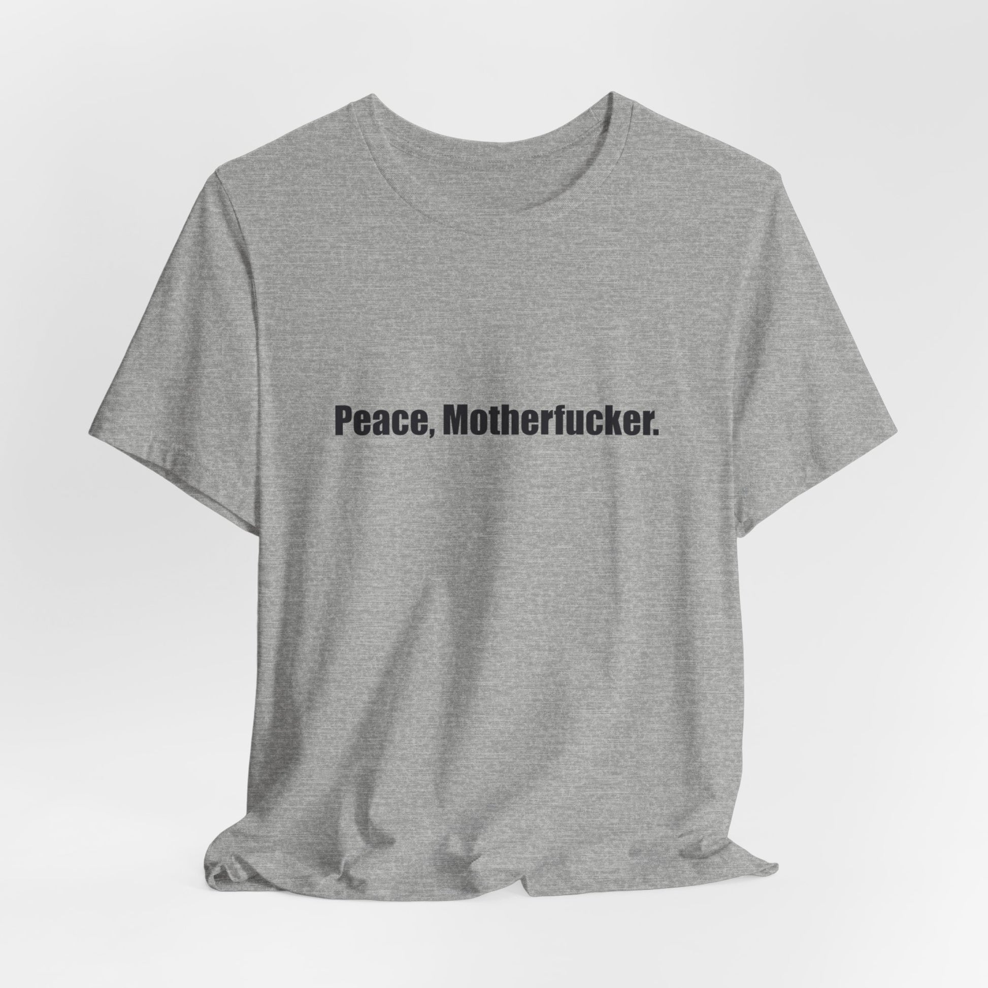 Peace, Motherfucker. This classic unisex jersey short sleeve tee fits like a well-loved favorite. Soft cotton and quality print make users fall in love with it over and over again. These t-shirts have-ribbed knit collars to bolster shaping. The shoulders are tapered for a better fit over time. Dual side seams hold the garment's shape for longer. .: Made with 100% Airlume combed and ring-spun cotton, a lightweight fabric (4.2 oz/yd² (142 g/m²)) that is easy to layer, breathable. Perfect for active and leisure wear. .: The retail fit that is perfect for casual and semi-formal settings. The crew neckline adds a classic, neat style that's perfect for accessorizing. .: Bella+Canvas manufactures all its products in the US and internationally in humane, no-sweat-shop, sustainable way and is part of the Fair Labor Association as well as Platinum WRAP certified. .: The tear-away label minimizes skin irritations. .: Fabric blends: Ash - 99% Airlume combed and ring-spun cotton, 1% polyester; Heather colors - 52% cotton, 48% polyester; Athletic Heather and Black Heather - 90% cotton, 10% polyester.